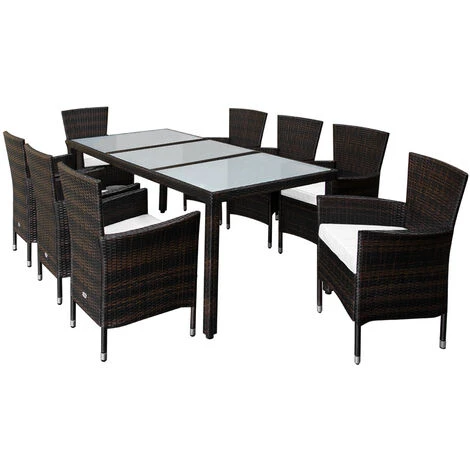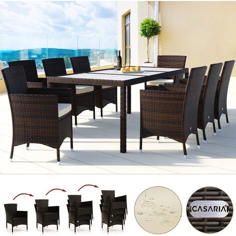 Set di 17 pezzi in polyrattan composto da 1 tavolo, 8 sedie con 8 cuscini sfoderabili (doppia cucitura).