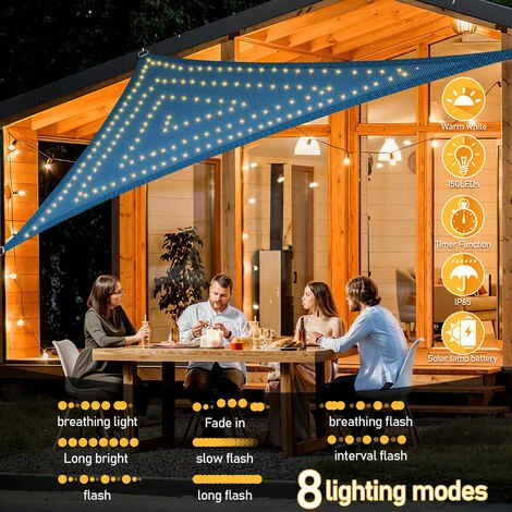 Design combinato della vela ombreggiante e della luce di stringa: la vela ombreggiante ha una luce di stringa di 15 metri e la luce di stringa ha 150 perle di lampadine LED; utilizzando lampadine LED bianche calde con una maggiore luminosità , l’energia