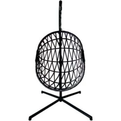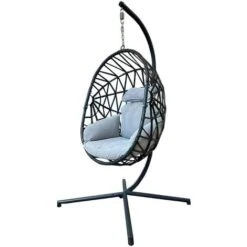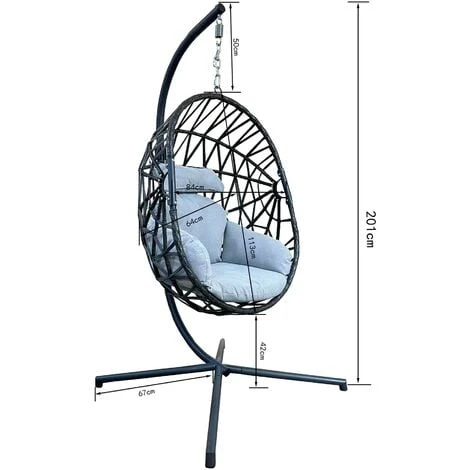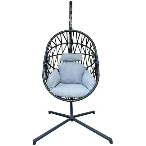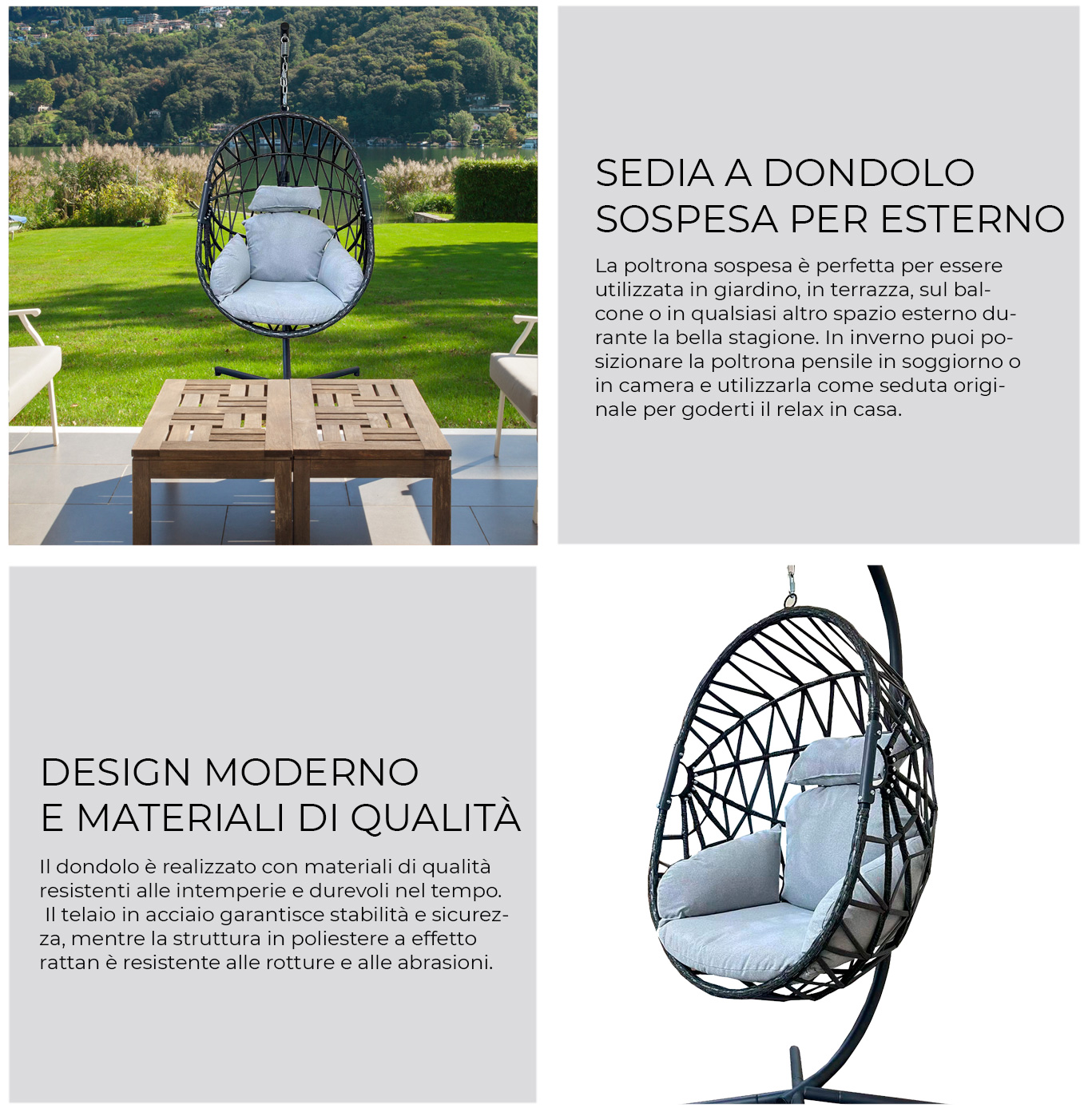 – SPECIFICHE: Dimensioni totali: H 200 x L 128 x P 128 cm – Cesta: H 117 x L 62 x P 88 cm – Distanza cesto da terra: 70 cm – Catena superiore regolabile: 24 – 52 cm – Telo: H 190 x Ø 115 cm – Colore cesta: grigio scuro – Materiale struttura: acciaio verniciato a polvere – Cesta: Polietilene effetto rattan, corda – Cuscini: Tessuto poliestere – Imbottitura cuscino seduta: spugna – Cuscino poggiatesta: cotone – Peso max supportato: 150 kg – Da montare: sì – Cod. RE6825