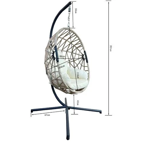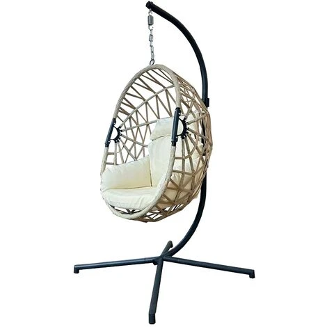 – SPECIFICHE: Dimensioni totali: H 200 x L 128 x P 128 cm – Cesta: H 117 x L 62 x P 88 cm – Distanza cesto da terra: 70 cm – Catena superiore regolabile: 24 – 52 cm – Telo: H 190 x Ø 115 cm – Colore cesta: beige – Materiale struttura: acciaio verniciato a polvere – Cesta: Polietilene effetto rattan, corda – Cuscini: Tessuto poliestere – Imbottitura cuscino seduta: spugna – Cuscino poggiatesta: cotone – Peso max supportato: 150 kg – Da montare: sì – Cod. RE6826