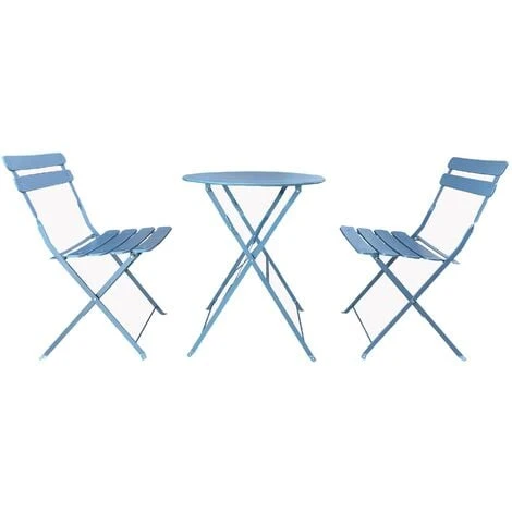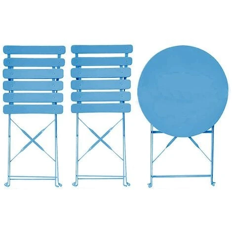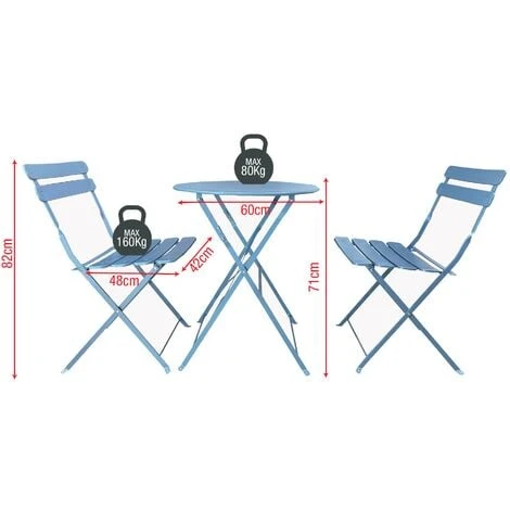 – SPECIFICHE: Dimensioni tavolo: H 71 x L 60 x P 60 cm – Dimensioni sedie (2): H 82 x L 42 x P 48 cm – Dimensioni tavolo chiuso: H 93 x L 59 cm – Dimensioni sedie chiuse: H 94 x L 42 x P 5 cm – Materiale: acciaio verniciato a polvere con trattamento anti ruggine – Colore: azzurro – Peso max supportato dal tavolo: 80 kg – Peso max supportato dalle sedie: 160 kg – Da montare: no – Cod. RE6830