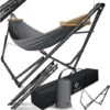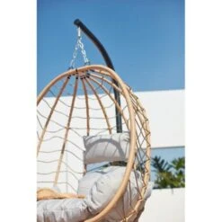 Poltrona sospesa in simil rattan con supporto. Lasciati conquistare da questa magnifica poltrona sospesa di design! Le forme arrotondate, adornate con piccole corde di colore naturale, conferiscono ancora più eleganza. Il grande cuscino assicura lunghi momenti di relax. La sua struttura in acciaio rende il set molto resistenze e il rivestimento in resina intrecciata ne assicura la durabilità! Il colore naturale si adatterà a qualsiasi tipo di arredamento, sia all’interno che all’esterno, e aggiungerà un tocco accogliente alla tua casa! Potrai dare eleganza al tuo arredamento, che sia bohémien o scandinavo. Questa sedia si adatterà sicuramente al posto che le riservi! Caratteristiche tecniche. Colore principale: Rattan naturale. Colore secondario: Nero. Materiale sedia: Resina effetto rattan. Rivestimento struttura: Verniciatura a polvere (finitura resistente). Numero di posti: 1. Numero di cuscini: 1 cuscino grande. Cuscino rimovibile: Sì. Tipo di schiuma: Cotone PP. Densità della schiuma: 150 g. Rivestimento cuscino: Impermeabile. Peso massimo supportato: 160 x 200 cm kg. Manutenzione: Rimuovere regolarmente la polvere con un panno asciutto. Pulire e asciugare con un panno umido. Proteggi i tuoi mobili coprendoli durante i mesi invernali o se inutilizzati per lunghi periodi di tempo. Dimensioni. Dimensioni totali (esterne): 95 x 95 x 197 cm. Dimensioni sedia: 64 x 94 x 112 cm. Peso sedia: 8,3 kg. Dimensioni supporto: 95 x 95 x 197 cm. Peso supporto: 14,4 kg. Peso totale: 22,7 kg. Dimensioni piede: 95 x 95 x 20 cm. Imballaggio. Il prodotto viene consegnato in 1 collo da: 98 x 70 x 73 cm – 33 kg.
