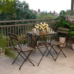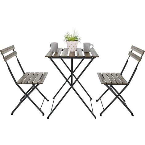 La struttura del set è realizzata in acciaio verniciato che ne garantisce la robustezza e la durata a lungo termine mentre gli schienali delle sedie ed il top del tavolino sono in robusto legno di acacia.