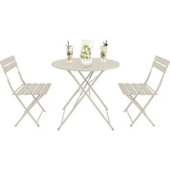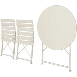Il set è composto da 2 sedie pighevoli ed un tavolino tondo anch’esso pieghevole, studiati per essere riposti facilmente quando inutilizzati.