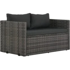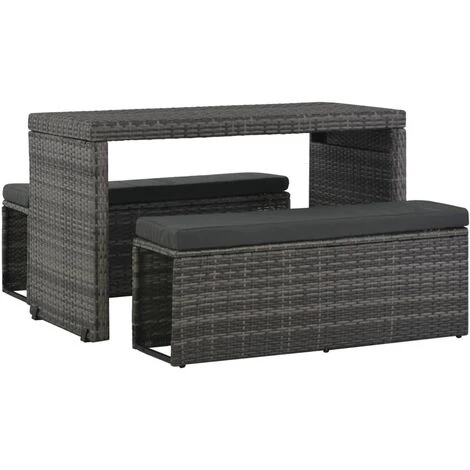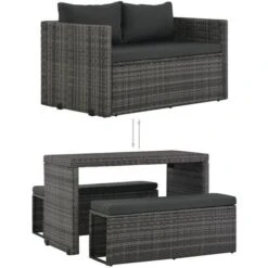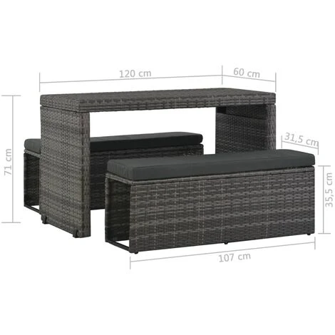 Questo versatile set da pranzo in polyrattan è composto da 1 tavolo, 2 panche, 2 cuscini e 2 cuscini per seduta. Creerà un’elegante area salotto nel giardino o nel patio. Può anche essere trasformato in un divano.