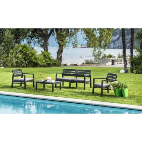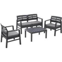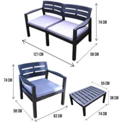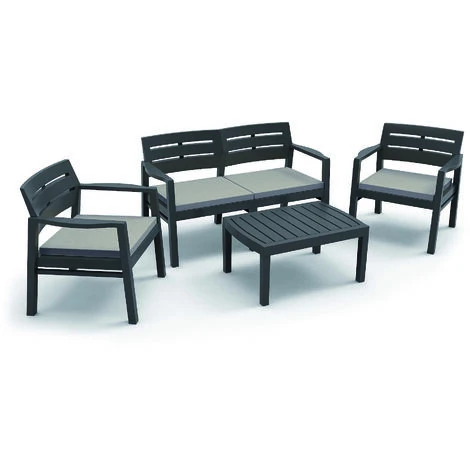 STRUTTURA E UTILIZZO – Articolo formato da un elegante set da esterno per quattro persone, composto da due sedie con schienale e braccioli, un divano a due posti ed un tavolino, cuscini inclusi – Le sedute spaziose ed accoglienti garantiscono relax e comodità in casa propria – Salottino perfetto per arredare il proprio spazio outdoor o indoor, grazie alla composizione in plastica rinforzata con effetto doghe che ne accresce lo stile – Perfetto per brunch ed aperitivi in terrazzo, veranda, giardino o per rilassarsi a bordo piscina.