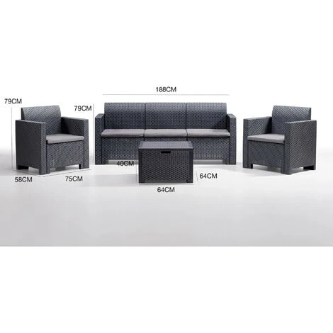 CARATTERISTICHE TECNICHE – Interamente composto in resistente polipropilene, permette di essere posizionato all’aria aperta, resistendo ai raggi solari e alla pioggia, è impermeabile e idrorepellente – Lavabile, facile da pulire – Montaggio semplice e veloce – Ideale per ospitare 5 persone – DIMENSIONI PRODOTTO IN CM – Poltrona: 75x58h79, Sofà : 188x58h79, Tavolino: 64x64h40