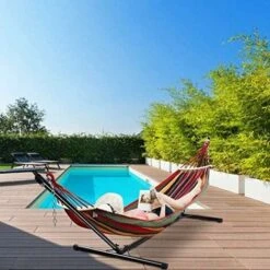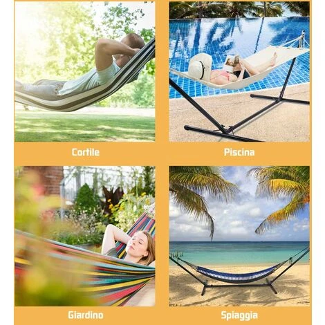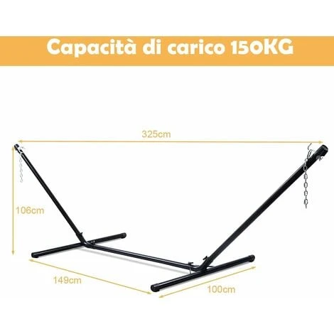 Il sostegno per amaca dimensioni di 320x110x100cm, è adatto per qualsiasi misura di amache. Il suo massimo carico di 150kg porterà una sicurezza assicurata durante il tuo sogno.Struttura di metallo, molto robusto e più facile da pulirlo.