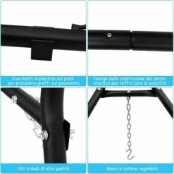 Il nostro supporto universale per amache è progettato per la maggior parte delle amache. Puoi appendere i tuoi diversi tipi di amache regolando 2 catene e 2 ganci a S. Realizzato con tubi di ferro con superficie verniciata a polvere, questo supporto per amaca è resistente alla corrosione ed alla ruggine, quindi è ideale per l’uso esterno come patio, veranda, coperta e cortile. Costituito da un telaio resistente, il supporto per amaca ha una grande capacità di carico fino a 200 kg, quindi è totalmente sicuro per l’uso di 2 persone. I cuscinetti in plastica sui piedi non solo aumentano la stabilità di questo supporto per amaca, ma evitano anche che il pavimento si graffi. Inoltre, il design della costruzione del perno a molla garantisce la stabilità dei pali ad incastro.