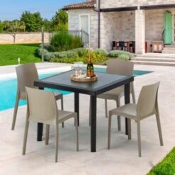 Rispetto ai normali tavoli da bar in plastica, il tavolo quadrato in polyrattan (polipropilene) di alta qualità BOHÈME ha una struttura più robusta, in quanto il materiale di fabbricazione possiede spessori maggiori che donano stabilità al prodotto. La dimensione del tavolino è 90×90 cm (quadrato), mentre l’altezza è pari a 74 cm.