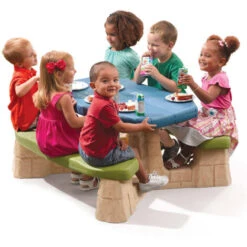 Chiedete ai vostri bambini di prendersi una pausa dal gioco e di rilassarsi con i loro amici su questo delizioso tavolo da picnic. Questo resistente tavolo include un ombrello per proteggere i bambini dal sole.