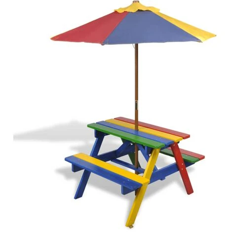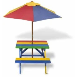 Questo fantastico tavolo da picnic con panchina in legno per bambini 2 in 1 è un ottimo modo per permettere ai tuoi piccoli di giocare o bere qualcosa con i loro amici sul tavolo robusto e colorato, mentre il parasole li protegge dal sole nelle giornate estive. Questo set da picnic è estremamente popolare tra i bambini per il suo adorabile color arcobaleno, l’attraente ombrellone e le comode panche su entrambi i lati.