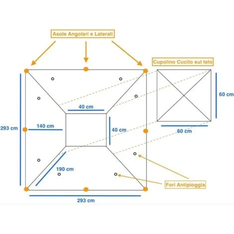 – La cuspide superiore antivento e’ composta da un foro di 48×48 cm e da un telo di 65×65 cm cucito sui 4 angoli al telo principale . Nella galleria immagini e’ presente uno schema per facilitare la comprensione delle misure.