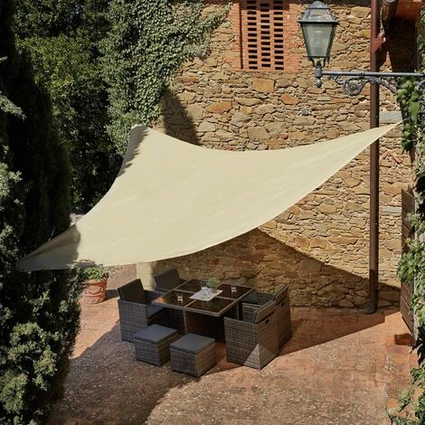 - Materiali: composizione tessile: vela ombreggiante e funi di irrigidimento in 100% polietilene, anelli in acciaio inox