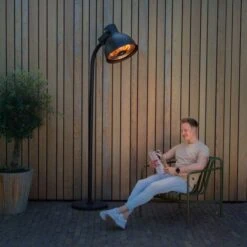 - La potente lampada a infrarossi da 2000W emette calore in modo mirato. Il riscaldatore è ideale da mettere all’esterno accanto al tavolo da cena o a un tavolo alto da appoggio.