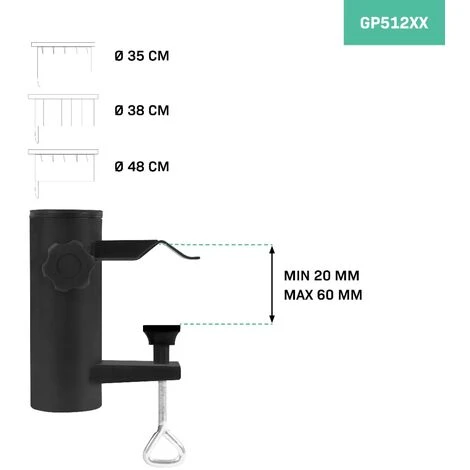 Il supporto è adatto al montaggio di tre misure di pali per ombrelloni. Il portapalo per ombrellone può essere utilizzato per pali con un diametro di: 35mm, 38mm o 48mm. Ti consigliamo di non utilizzare il porta ombrellone con l’ombrellone aperto in caso di vento forte. Anche quando hai l’ombrellone chiuso e c’è un forte vento, è consigliabile rimuoverlo comunque dal supporto.