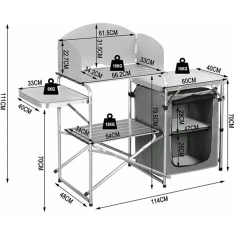 - Un tavolo da picnic ideale per il campeggio con più. persone. Dispone di 4 ripiani su cui puoi mettere il fornello. il cibo. la frutta e gli utensili necessari. Il ripiano superiore è. circondato da lastre in acciaio. le quali offrono protezione dal vento. Inoltre viene fornito con una grande borsa portaoggetti con una portata di 10 kg. Puoi fissarla sotto il tavolo per proteggere gli utensili o il cibo da polvere.