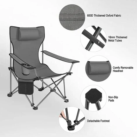Schienale regolabileLa sedia richiudibile può. essere trasformata in una sdraio o in un lettino da spiaggia grazie allo schienale regolabile. Per abbassare lo schienale. è. sufficiente premere i braccioli per sdraiarsi comodamente e rilassarsi. evitando la rigidità. muscolare causata da una posizione seduta prolungata. | Design portaoggettiIl portabicchieri ti consente di riporre la borraccia. il thermos o altre bevande. La tasca portaoggetti laterale ti consente di riporre i tuoi articoli personali. come cellulare. libri. riviste o occhiali da sole. | Materiale di alta qualità.La combinazione del tessuto Oxford traspirante e dei robusti tubi in acciaio rende la sedia da campeggio pieghevole più. resistente e durevole. | Poggiatesta rimovibileImbottito con spugna. il poggiatesta migliorerà. notevolmente il comfort durante l&rsquo.uso. Può. essere rimosso per la pulizia. |
