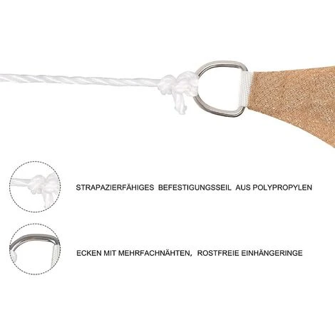 | 5 colori da scegliere: Beige/Verde/Grigio/Sabbia/Terracotta | Disponibile in molte dimensioni. 4 forme: Triangolo rettangolo/Triangolo/Quadrato/Rettangolo | Cucito rafforzato: In ogni angolo è. dotato di un anello in acciaio inox a forma di D per garantire una maggiora durabilità . | ogni tenda ha 3 o 4 corde. dipende dal numero degli angoli è. molto facile fissare la tenda all’albero con una corda |